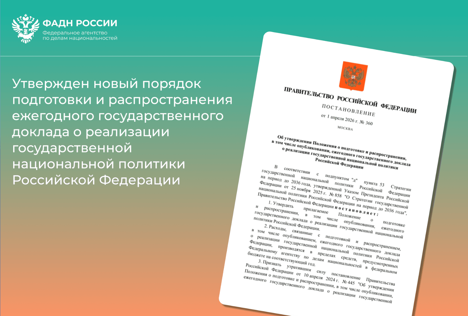 Правительство Российской Федерации постановлением от 1 апреля 2026 г. № 360 утвердило Положение о подготовке и распространении, в том числе опубликовании, ежегодного государственного доклада о реализации государственной национальной политики Российской Федерации.