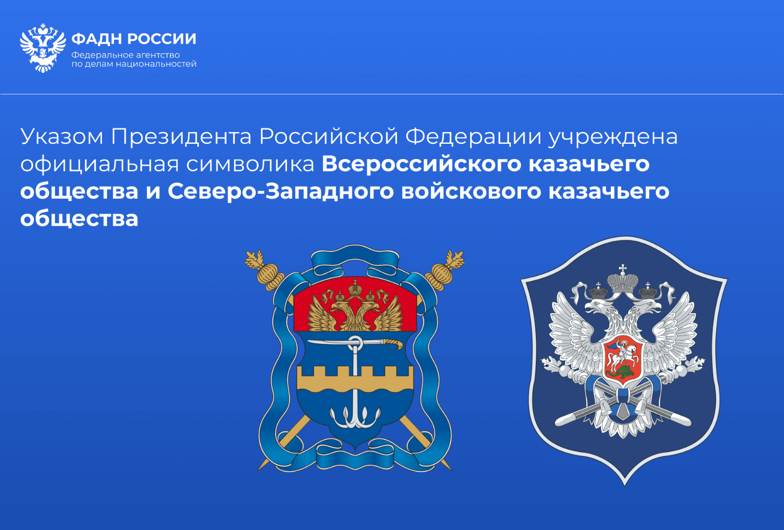 14 апреля 2026 г. с целью упорядочения официальных символов казачьих обществ, сохранения и развития исторических традиций российского казачества Президент Российской Федерации Владимир Путин подписал Указы об учреждении гербов, знамен и флагов Всероссийского казачьего общества и Северо-Западного войскового казачьего общества.