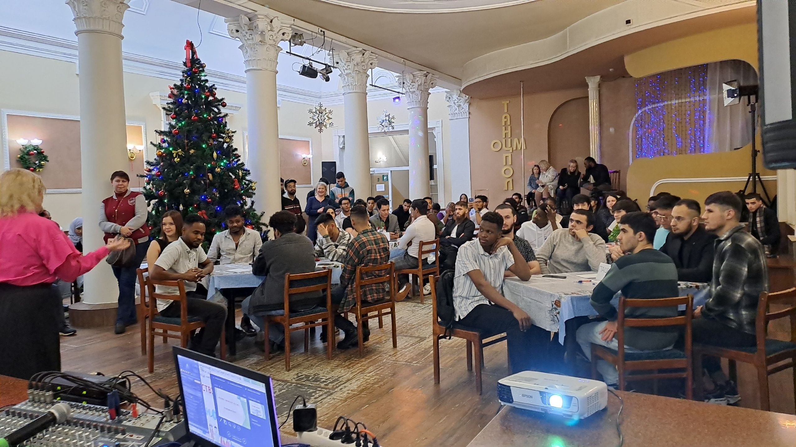 Приятным сюрпризом для студентов стали поздравления с Новым годом и забавные танцевальные русские игры от Деда Мороза и Снегурочки.