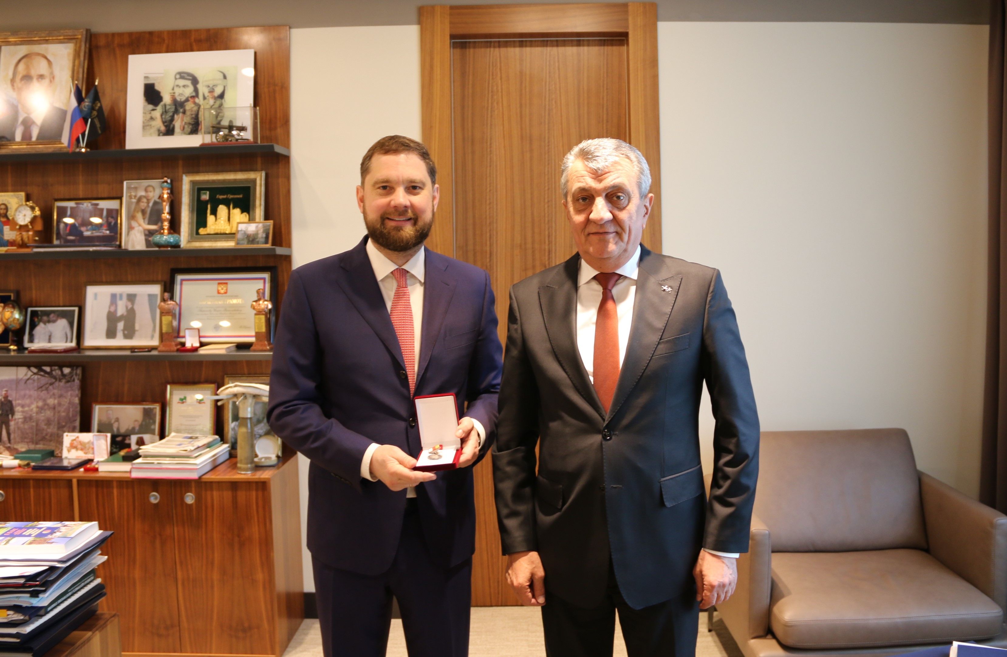 Сергей Меняйло поблагодарил за продуктивное взаимодействие, выстроенное между Республикой Северная Осетия – Алания и ФАДН России по вопросам развития межнациональных отношений, а также отметил личный вклад руководителя ведомства. В этой связи Игорь Баринов был награжден медалью «Во Славу Осетии».