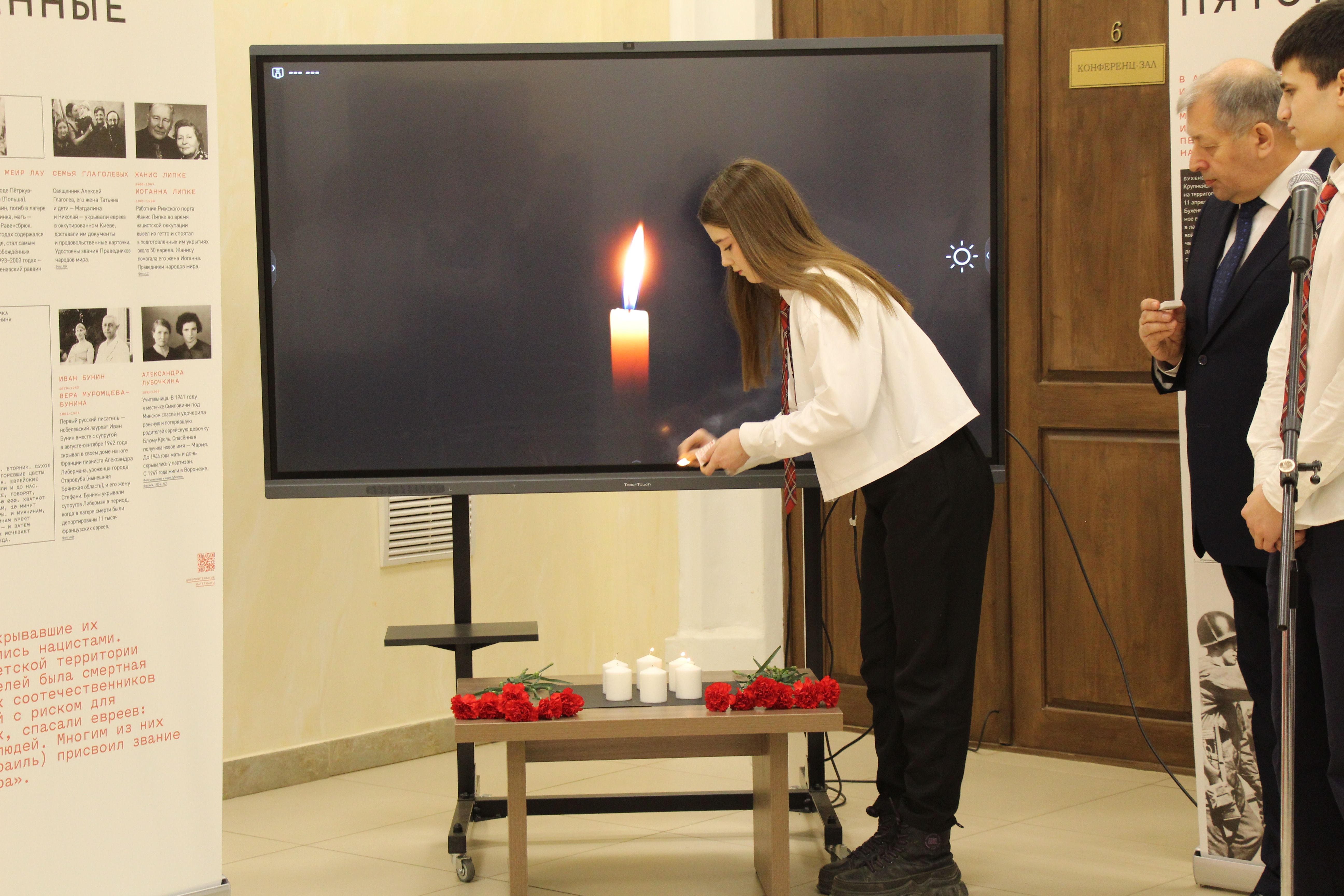 В рамках открытия выставки участники присоединились к Всероссийской мемориальной акции "Свеча памяти", которая посвящена шести миллионам евреев, ставших жертвами Холокоста.