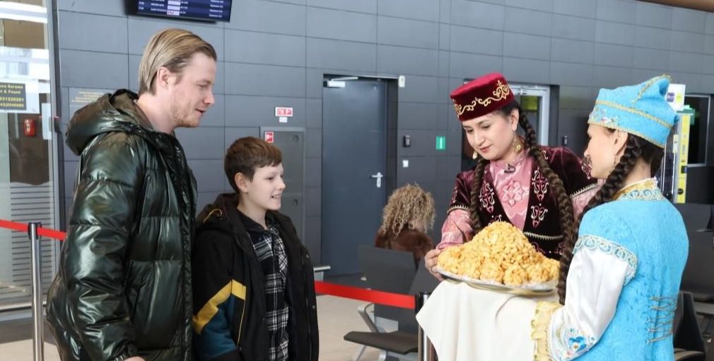 Творческая команда Дома Дружбы встретила гостя в аэропорту столицы Татарстана в национальных костюмах и по традиции угостила чак-чаком.