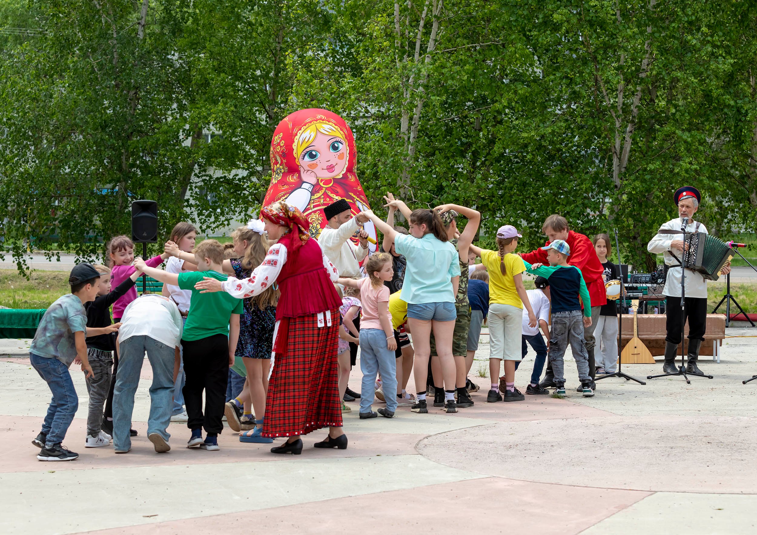 С участием ансамбля народной музыки «Традиция» на просторной летней площадке состоялся фольклорный интерактивный праздник для школьников «Мир славянских традиций», в котором приняли участие 180 школьников.